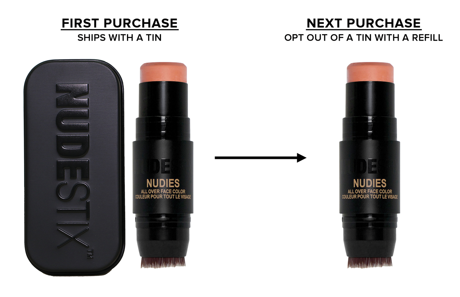 This means you can buy the NUDESTIX product without a tin. just re-use your pre-loved tin, rather than getting a new one. if you need any product label information, go to nudestix.Com product pages. Just one more way to save-a-tin.
